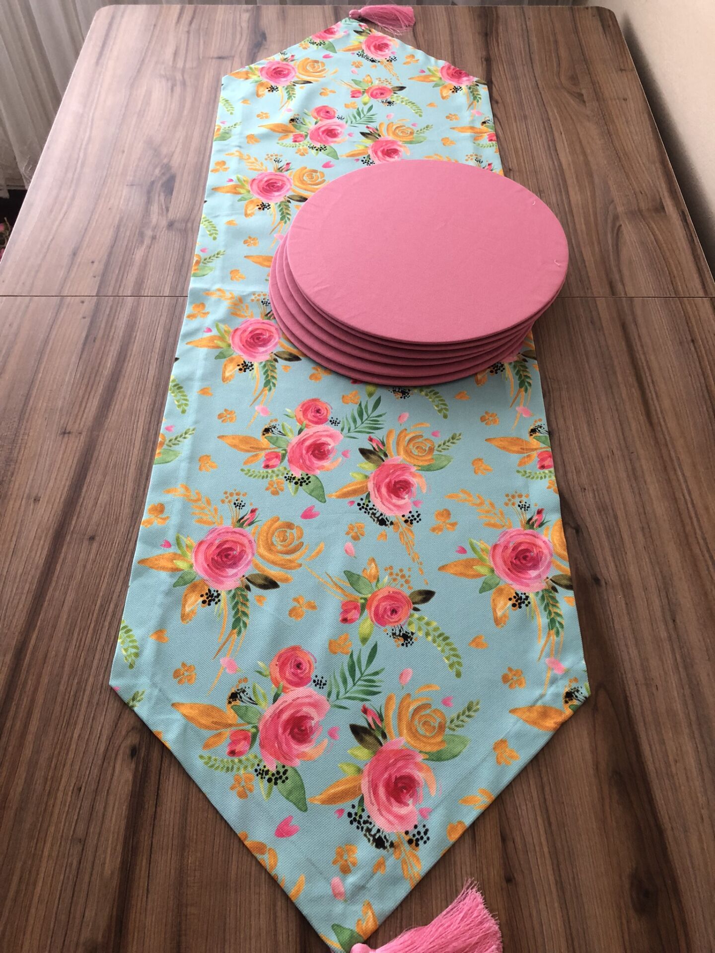 MİNT ZEMİN ÜZERİNE PEMBE GÜL DESENLİ RUNNER &SUPLA