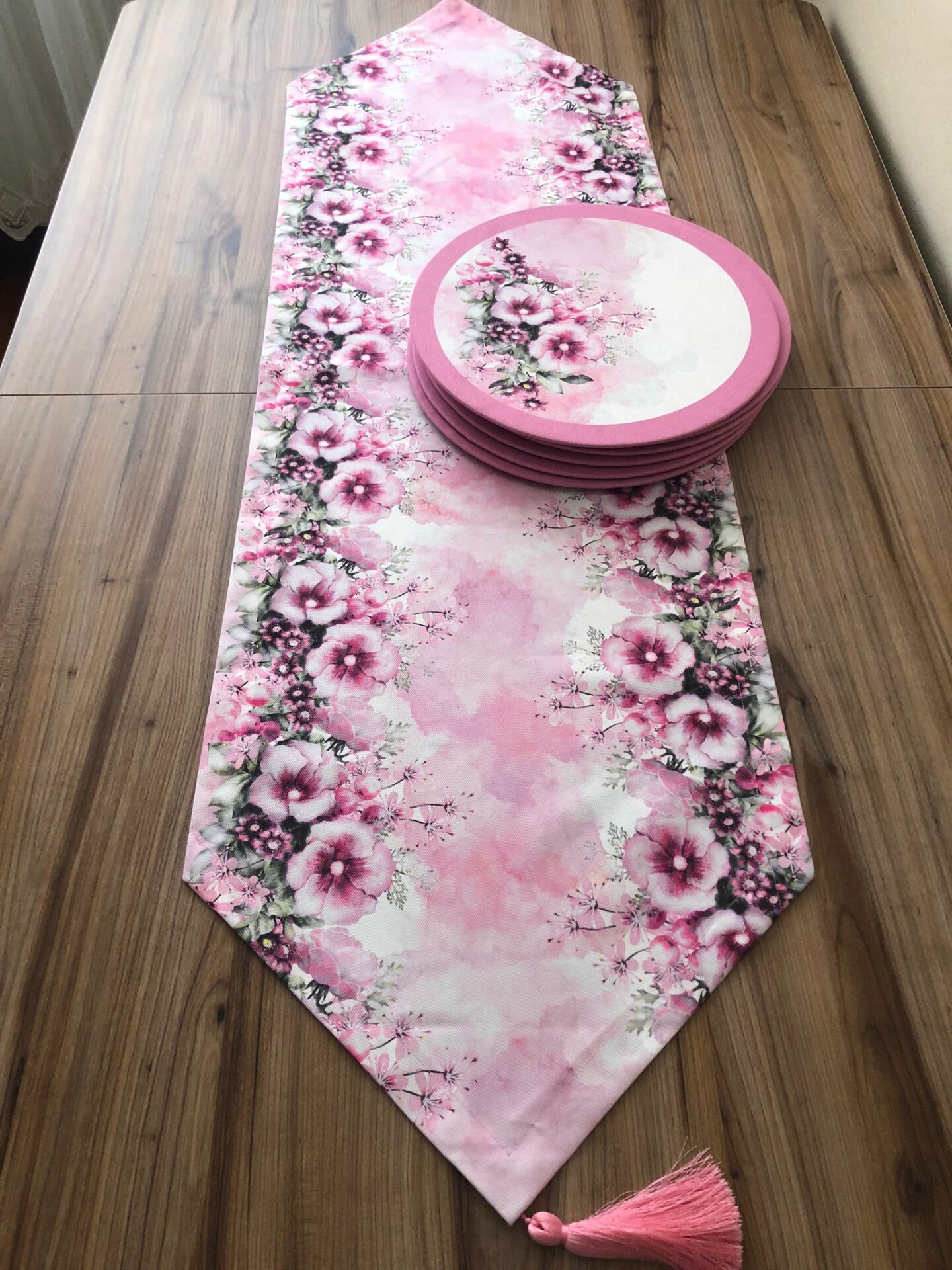 PEMBE ÇİÇEK DESENLİ RUNNER & DESENLİ SUPLA