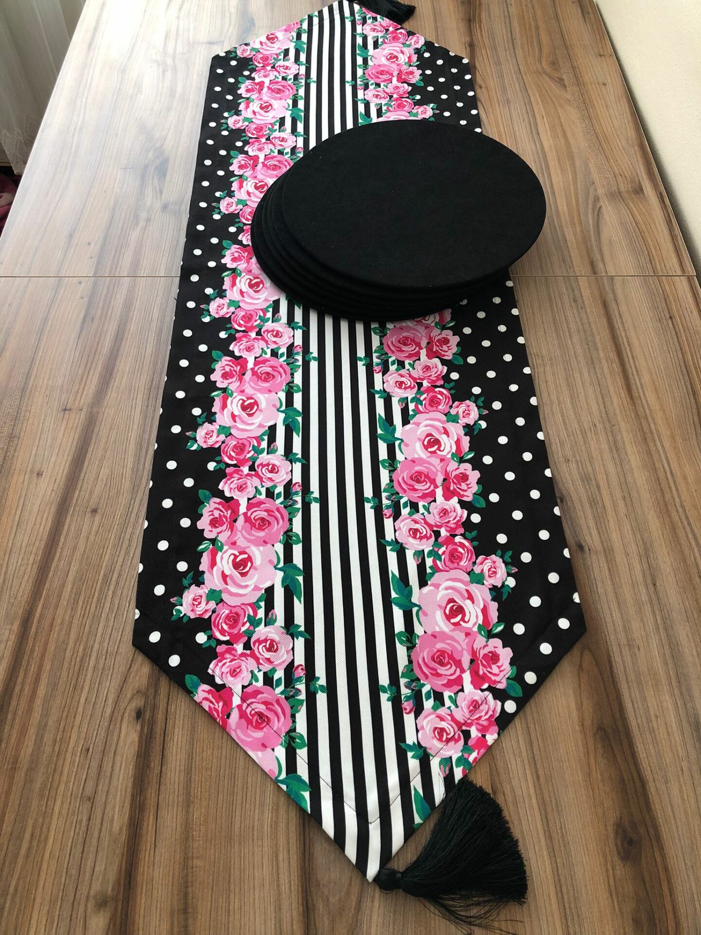 SİYAH ZEMİN PEMBE GÜL DESENLİ RUNNER & SİYAH SUPLA