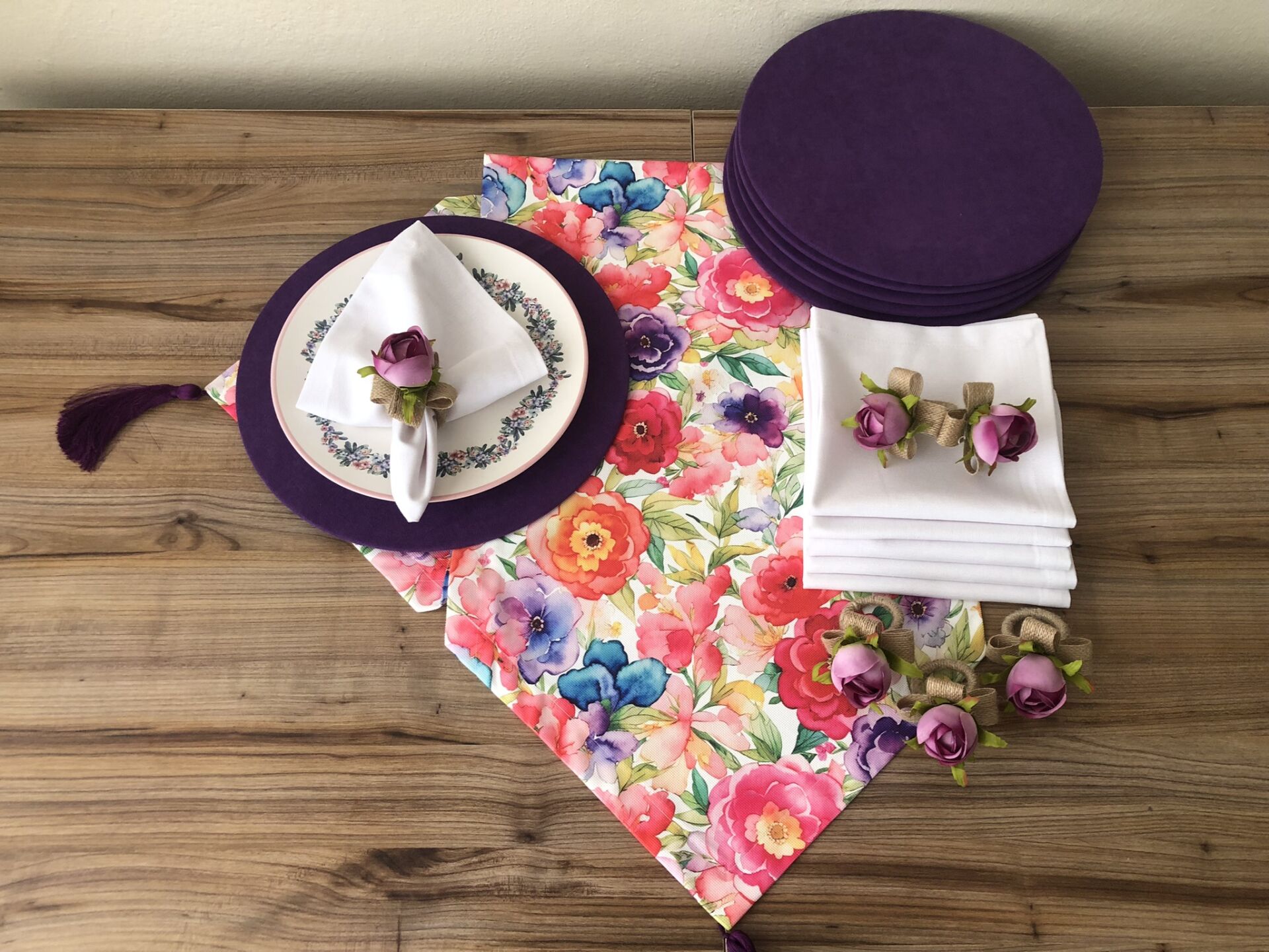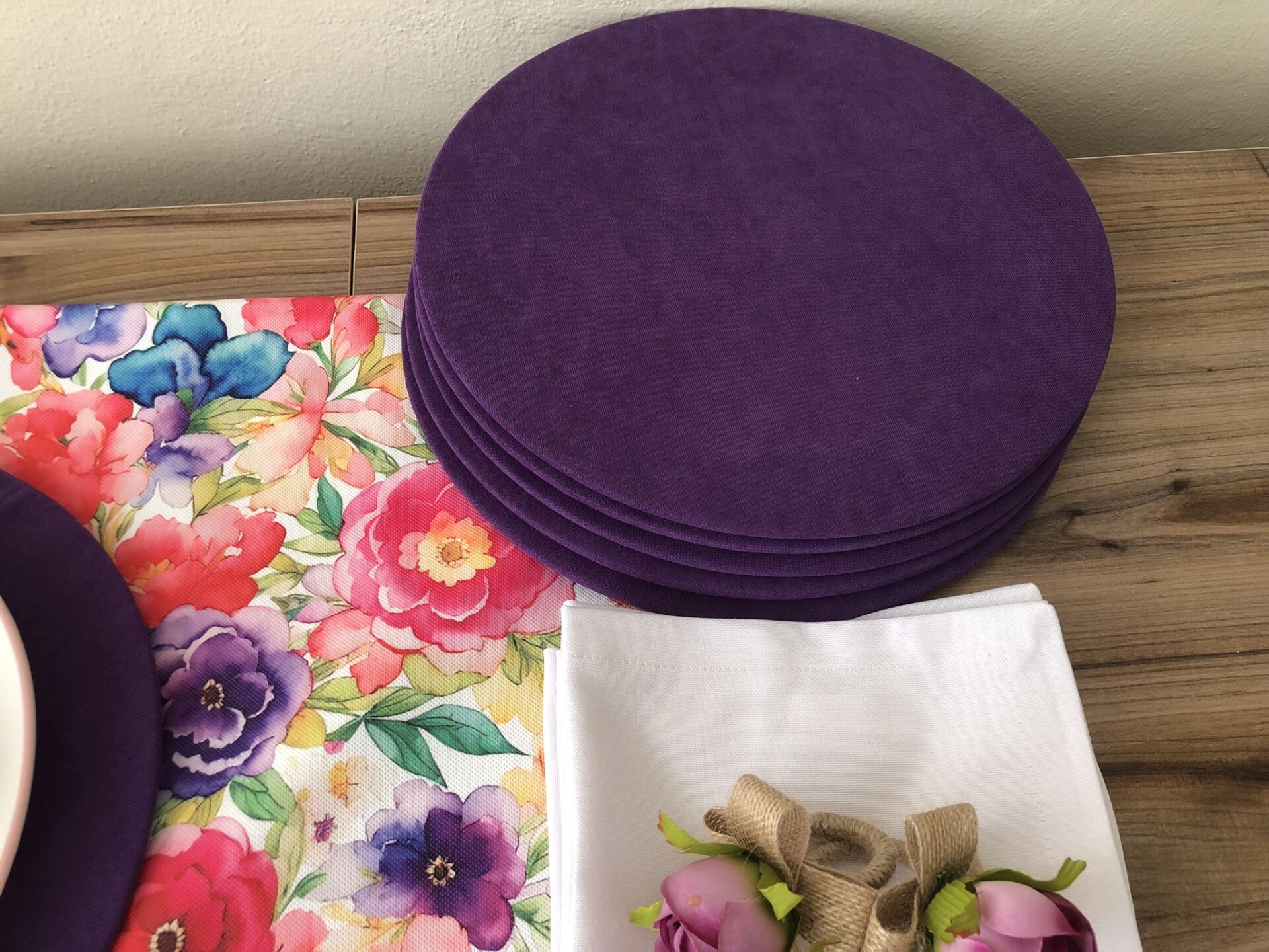v DÜZ RENK DUCK BEZİ KUMAŞLARLA ÖZENLE YAPILMIŞ SUPLALAR 33 CM ÇAPA VE PEÇETELER 40X40 CM SAHİPTİR.
