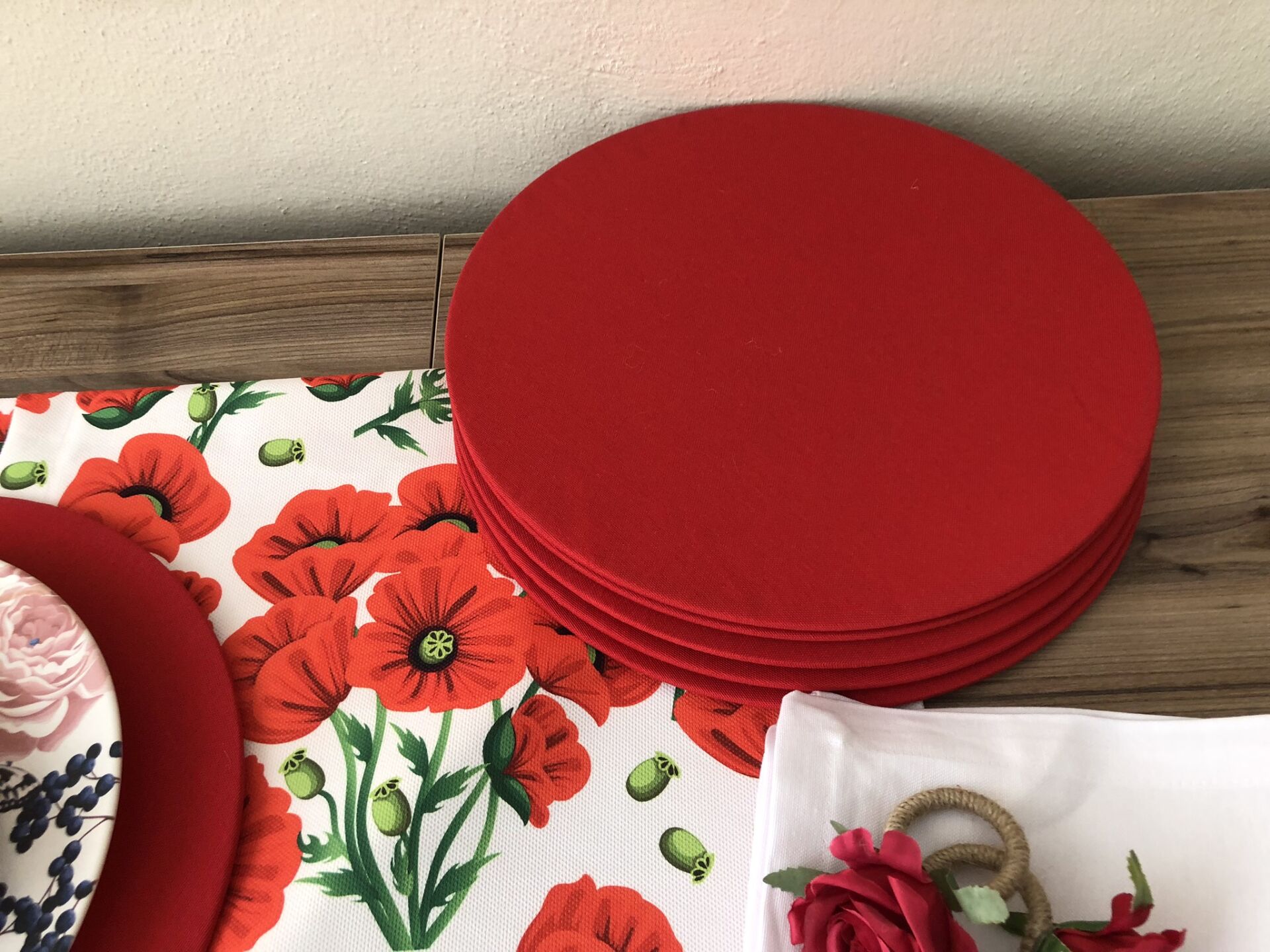 v DÜZ RENK DUCK BEZİ KUMAŞLARLA ÖZENLE YAPILMIŞ SUPLALAR 33 CM ÇAPA VE PEÇETELER 40X40 CM SAHİPTİR.